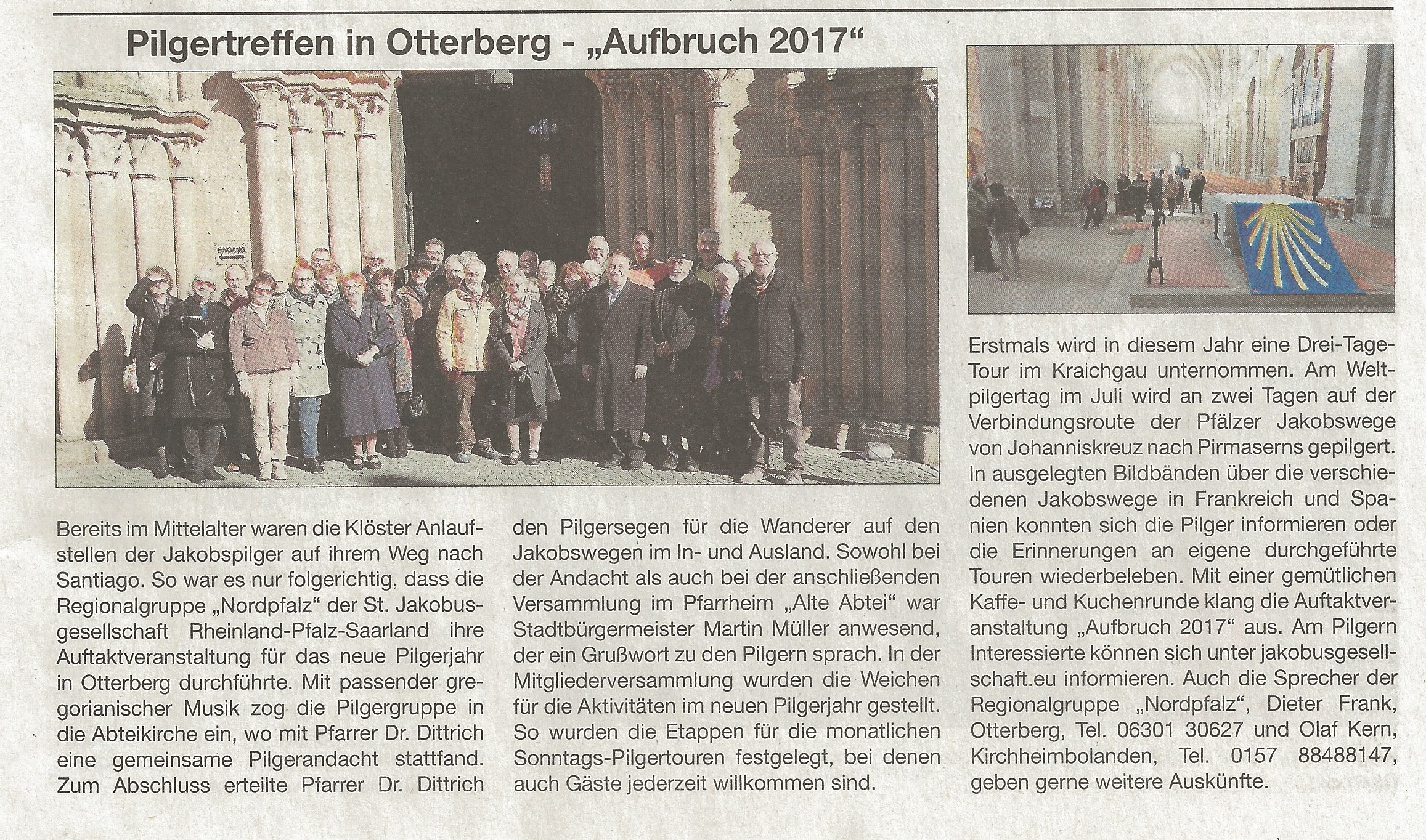 https://www.wochenblatt-reporter.de/speyer/c-ausgehen-geniessen/neuer-pilgerfuehrer-jakobsweg-klosterroute-fuehrt-von-worms-bis-metz_a390956 Newsletter der Regionalgruppe „Wir bleiben in Kontakt“ Um während der Pandemie, in der keine Präsenzveranstaltungen stattfinden dürfen, in Kontakt zu bleiben, haben wir einen Newsletter „Wir bleiben in Kontakt“ ins Leben gerufen. Die Intension dabei ist, wer einen Beitrag, welcher Art auch immer (Pilgerbericht, Gedicht, Foto, etc.) beisteuern möchte, der macht das einfach. Heraus kommt eine Rundmail mit Beiträgen „von Euch für Euch“. Beiträge als Textform (nicht PDF) und Fotos darf jeder an info@olaf-kern.de einsenden. Der Einsender bestätigt mit Einsendung die Eigentumsrechte an dem Dokument/Foto und ist mit der Veröffentlichung einverstanden. Bisherige Ausgaben: Ausgabe 1, Bericht vom Hildegardisweg Ausgabe 2 Ausgabe 3 Auftakt zur Pilgersaison 2019 der Regionalgruppe Nordpfalz (ok) Aus mittlerweile guter Tradition luden die Regionalsprecher der Nordpfalz ihre Mitglieder und Pilgerinteressierte am 24. Februar 2019 nach Otterberg in das Pfarrheim „Alte Abtei“. Auftakt der Veranstaltung war eine von der Pastoralreferentin Christiane Gegenheimer und Dieter Frank organisierte Andacht mit Impulsen und Pilgersegen im Kapitelsaal der Otterberger Abteikirche. Im Anschluss erfuhr die über dreißigköpfige Gruppe bei einer Stadtführung einiges über die Historie Otterbergs und der Region. Zurück im Gemeindehaus schmiedete die Gruppe Pläne für die Pilgersaison und legte Termine und Touren fest. Der Ausklang fand bei Kaffee und selbstgebackenem Kuchen statt.